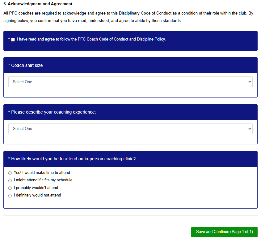 Please read and agree to the Coach Code of Conduct and answer a few final questions about yourself. Click the green button at the end.