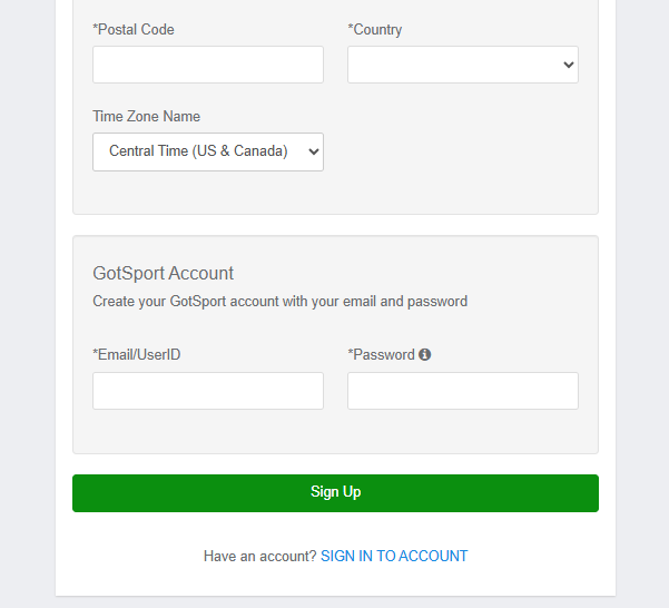 After you have entered your email address and password at the bottom, click Sign Up. Reminder: This username (email address) and password will also be the single account for all players in your family.