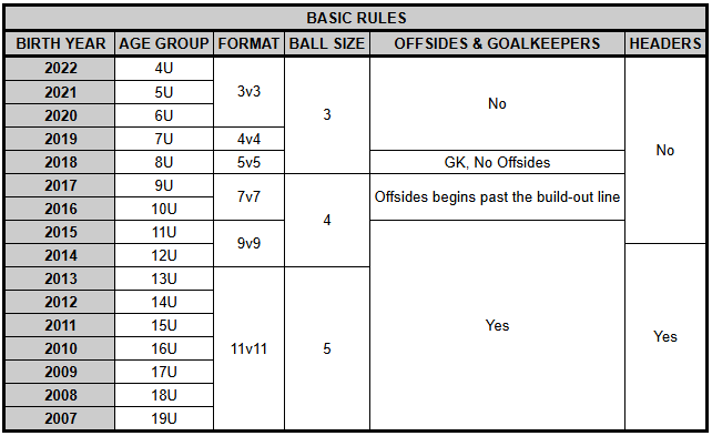 FIFA rules shall apply except where such rules conflict with these rules and, in these instances, these guidelines are adopted. Unless explicitly stated, rules for 10U apply to 9U.