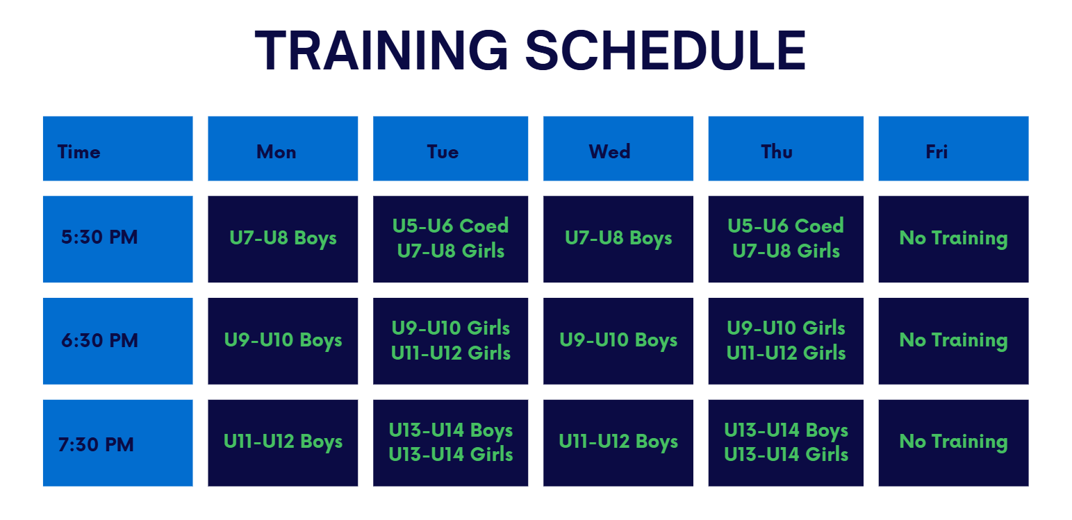 Players will choose between training once or twice per week with our professional coaching staff (training schedule below).